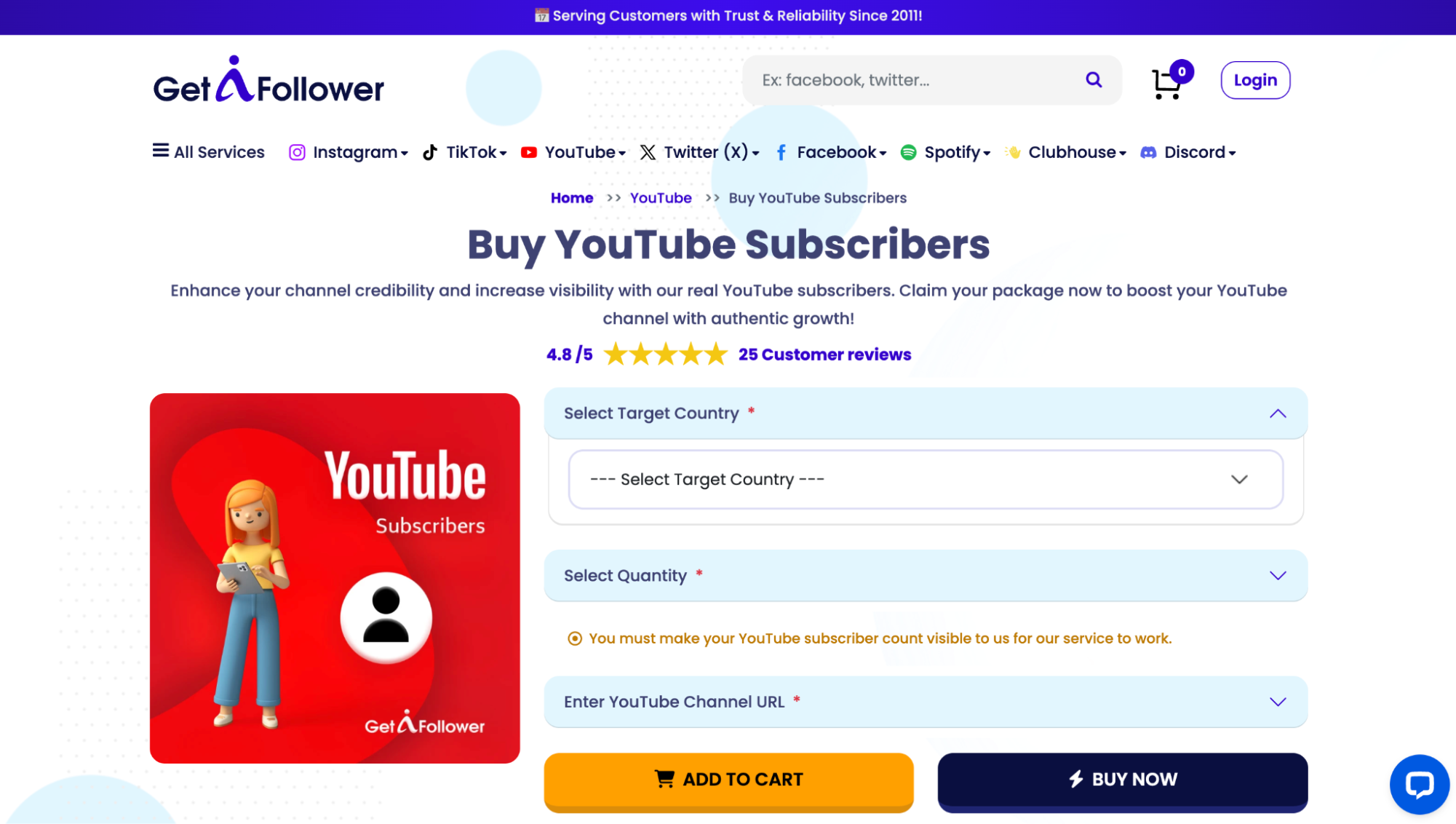 GetAFollower stands out for people looking to buy affordable YouTube subscribers safely and quickly. The platform focuses on ease and flexibility. It supports all video formats, Shorts, tutorials, and live streams, helping creators grow across every content type. Orders begin instantly: choose a plan, paste a channel link, and pay in a few clicks.